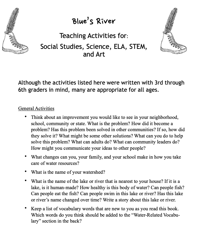 (Free) Teacher’s Guide For Blues River – The teacher’s guide provides activities and questions that are relevant to the elementary school science, social studies, STEM, ELA, and art curricula. Blue’s River is written for an audience of all ages, but especially for grades 3 through 6. I would love to hear which activities you liked best. I’ve included page one below as an example. Pages that follow include questions for each chapter.